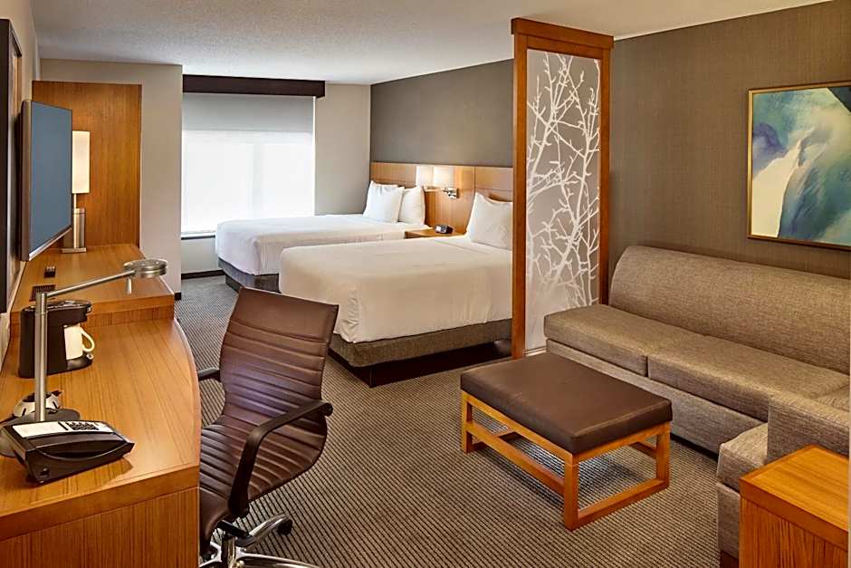 This room features two queen beds, a sofa bed and State College views from higher floors.